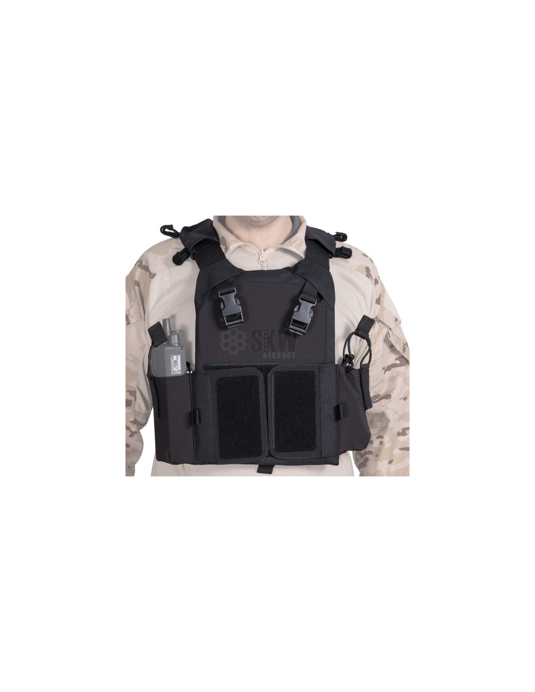 En la parte frontal cuenta con dos clips hembras para poder acoplarle los paneles pre configurados de Delta Tactics y una zona de velcro hembra para darle mayor sujeción a los paneles. Además cuenta con dos pouches, uno en cada lateral de la cummerbund, donde podremos guardar desde 2 cargadores por pouch hasta una radio PRC 148 or 152.